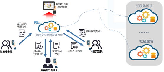 基于以上原因,医院引入“安全隐患巡查系统”用于改善和加强医院安全管理行为。通过移动互联网技术为医院搭建安全管理云平台,统一各层级安全管理人员的行为,从而实现安全隐患排查、信息共享和数据统计分析等安全管理行为。