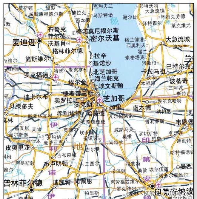 芝加哥还有37条铁路干线,呈辐射状向周围扩散,可以说芝加哥也是火车拉来的城市。此外,芝加哥港是美国最大的内陆港口,从这经过五大湖到圣劳伦斯内河航道,顺着就能进入大西洋到达欧洲,还可以经过芝加哥河到密西西比河,再通往墨西哥湾。